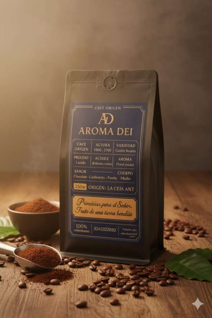 Aroma Dei es un café de origen colombiano que rinde homenaje a la excelencia de las montañas de Antioquia. Cultivado entre los 1.900 y 2.100 metros de altura, este café revela una taza limpia, brillante y profundamente aromática. Su proceso de lavado resalta notas florales y dulces que evocan la frescura de la tierra fértil donde nace. En boca ofrece un equilibrio perfecto entre acidez cítrica y suavidad, con matices de chocolate, caramelo y panela. Su cuerpo medio lo hace elegante y fácil de disfrutar, tanto en métodos filtrados como en espresso. Cada grano es seleccionado con rigor para garantizar calidad constante. Aroma Dei no es solo café: es una experiencia sensorial que conecta tradición, fe y origen. Ideal para quienes buscan un café premium con identidad. Un café pensado para el ritual diario y los momentos especiales. Fruto de una tierra bendita, hecho para paladares exigentes.